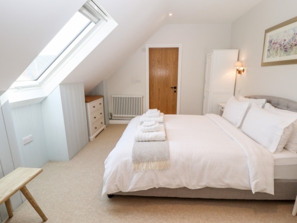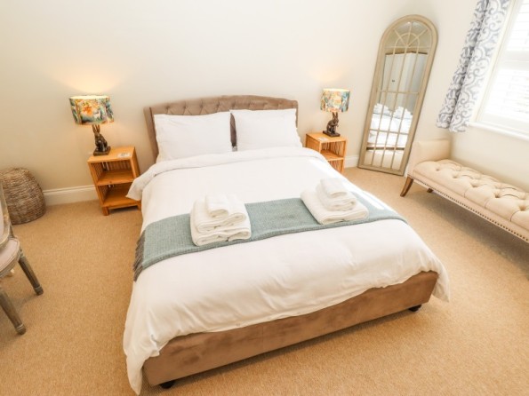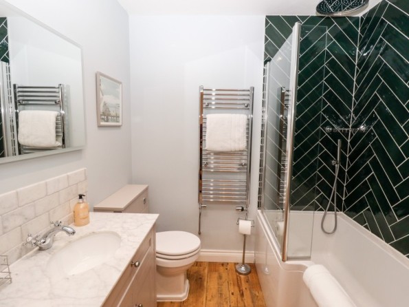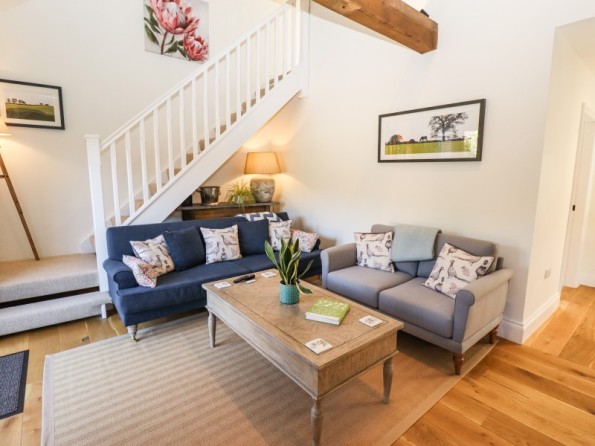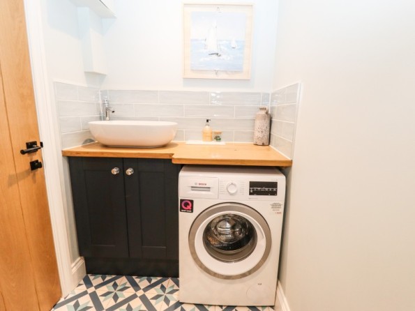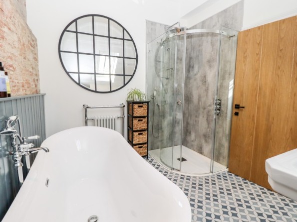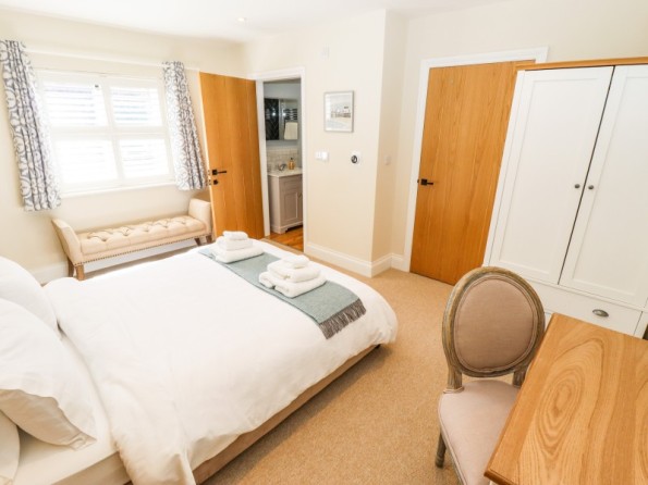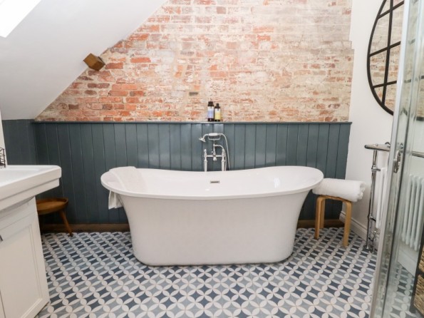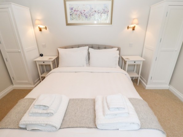 Two bedrooms: 1 x ground-floor king-size with en-suite bath with shower over, basin, WC, 1 x first-floor king-size with en-suite freestanding bath, separate shower, basin and WC. Cloakroom/utility with basin, WC and washing machine. Open-plan living space with kitchen, dining area and sitting area