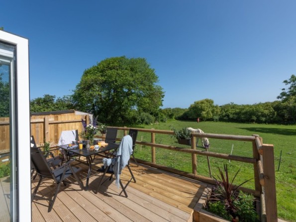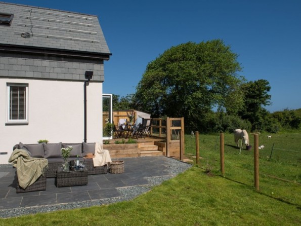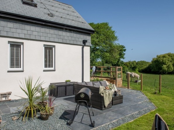 Secure garden with fence and chicken wire that separates it from the paddock. A raised deck which leads from the living room has a dining table and six chairs with lovely countryside views. Down from the deck via a few steps there is a lovely, paved patio with an outdoor rattan style lounge suite of sofas, table and footstool as well as two garden loungers and a charcoal BBQ
