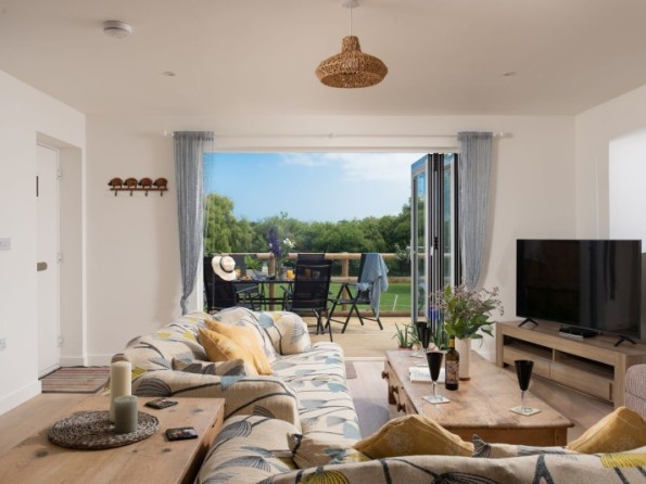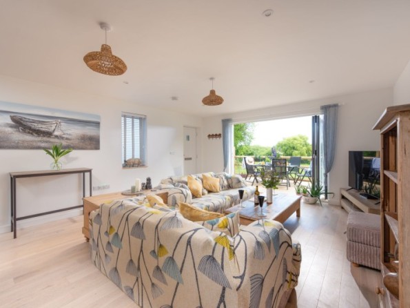 The ground floor living room is open plan with the kitchen and dining room. Two large sofas and upholstered ottoman, bookcase, coffee table, TV cabinet with Smart flat screen TV and side table / chest. The room leads right out to the deck through bi-fold doors and showcases far reaching countryside views