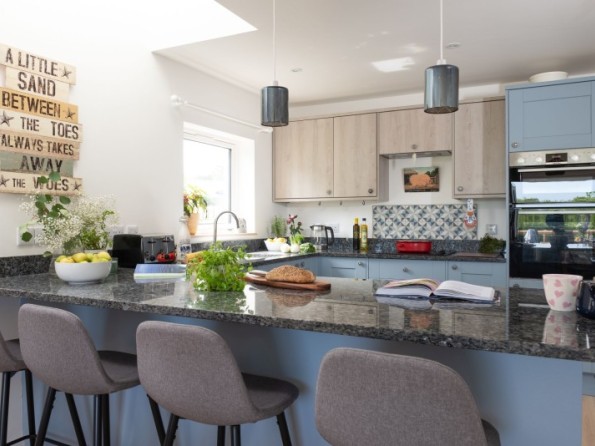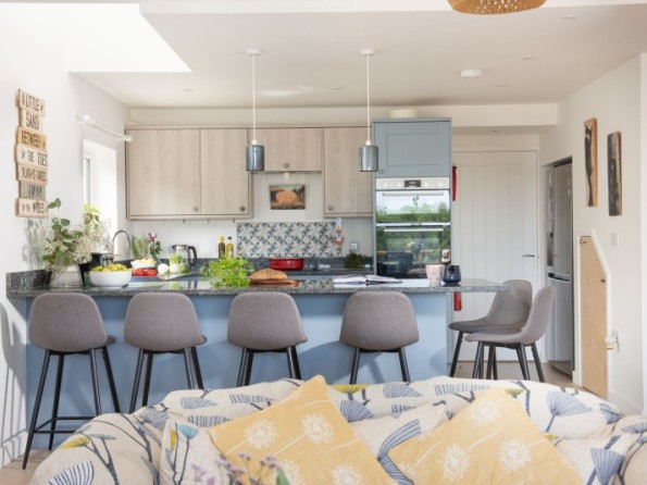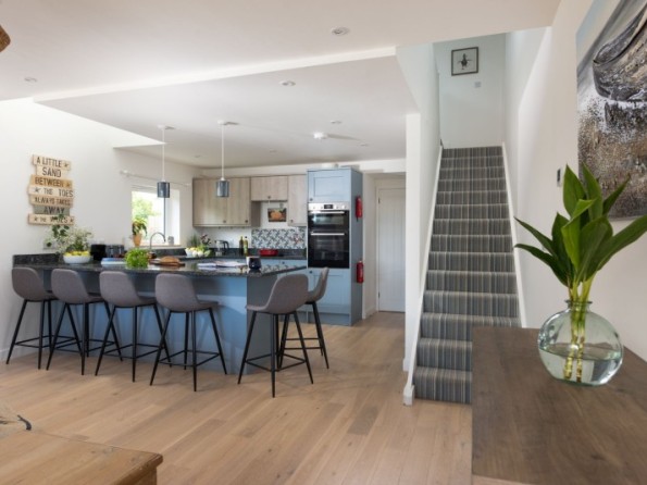 Open plan with the living room area, the kitchen features a large breakfast bar with six upholstered barstools. Its range of large and small appliances include an induction hob, electric single fan-assisted oven and grill, fridge, freezer, dishwasher, cafetiere, kettle, toaster and microwave. A selection of glasses, cutlery, crockery, cookware and utensils is provided