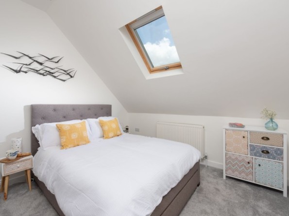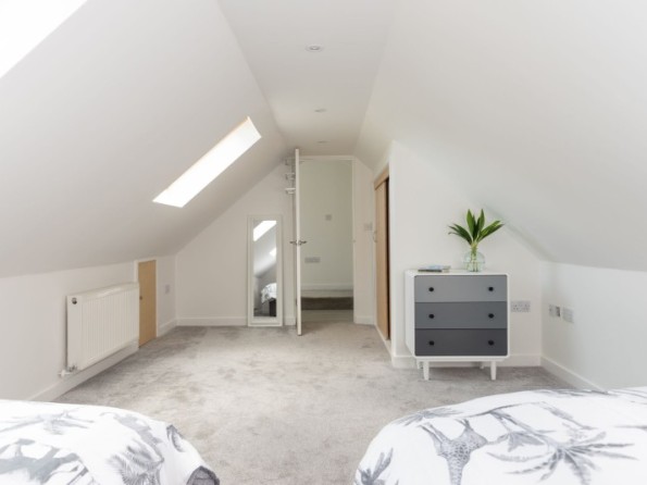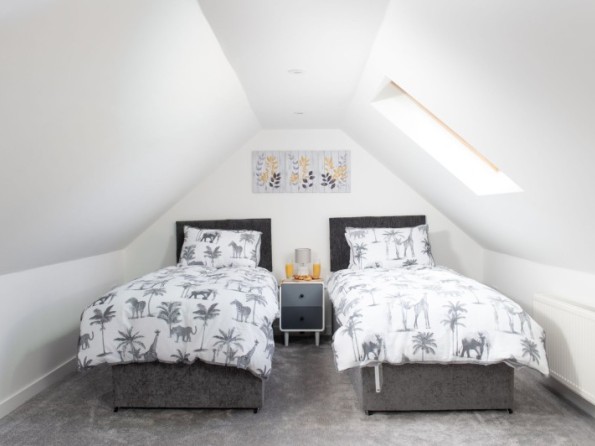 This superbly spacious room features apex ceilings and roof lights. It is furnished with twin beds, bedside tables and lamps, an integrated wardrobe, chest of drawers and a mirror