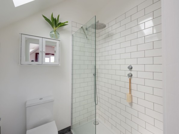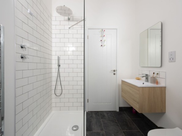 The en-suite to the master bedroom features a shower cubicle with waterfall shower, wash basin, heated towel rail and WC