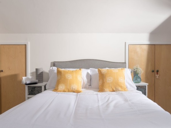 Located on the first floor the second bedroom has a double bed, bedside tables and lamps, a mirror, integrated wardrobe and chest of drawers