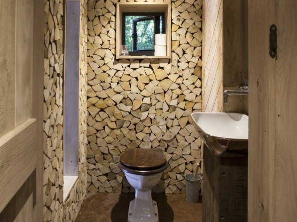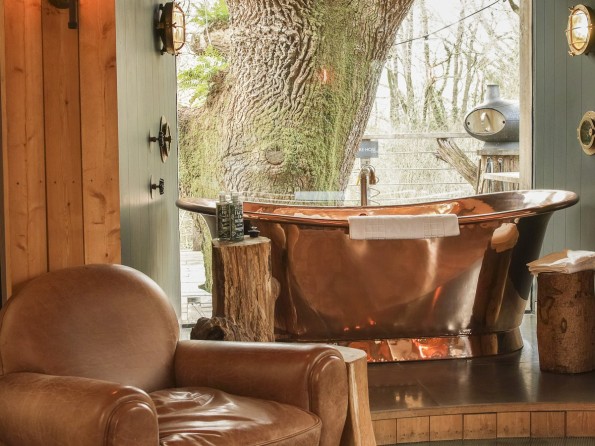 This treehouse accommodation simply oozes romance. Accessed down a pier-like boardwalk and across a rope bridge, inside is a central circular room with a revolving wood burner. Around the woodburner is a king sized bed, a fully equipped kitchen and a roll top copper bath. There’s an entrance area for coats and boots, and an ensuite flushing loo.