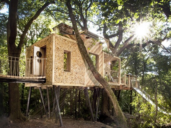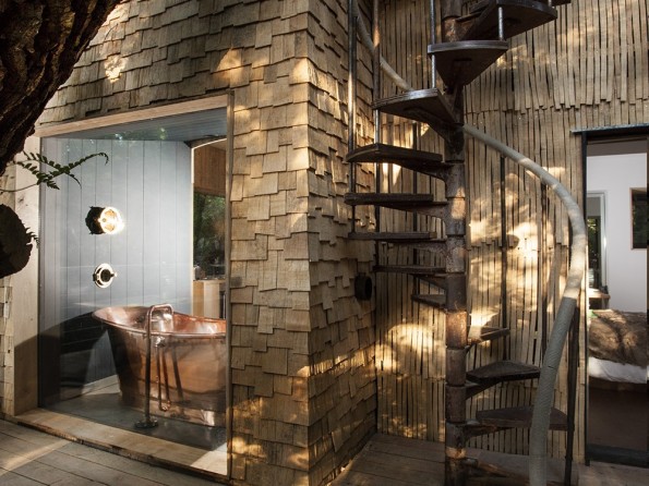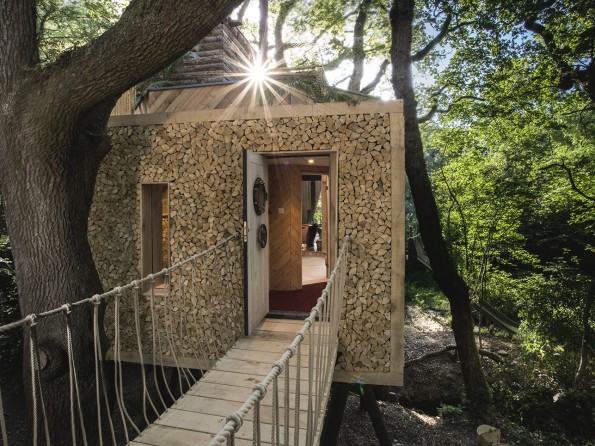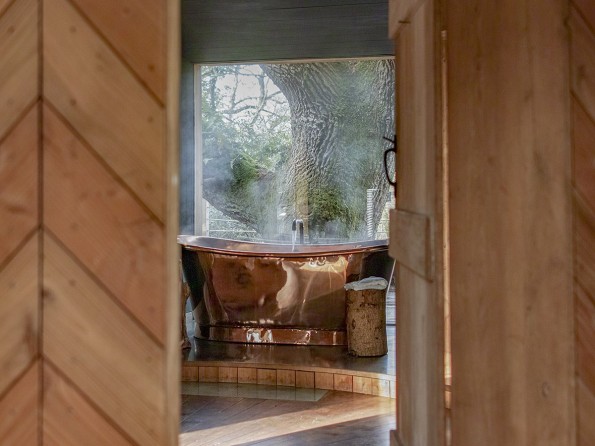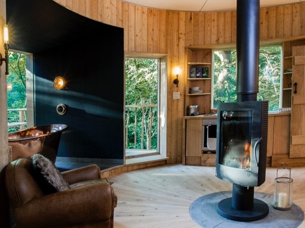 Treehouse accommodation like none other! Accessed via a rope bridge, this treehouse for two in a woodland setting in Dorset has a revolving woodburner, a copper bath, private hot tub, sauna and pizza oven, and a slide down to the woodland floor. Perfect for romantic retreats and honeymoons.