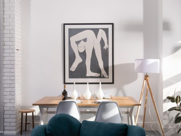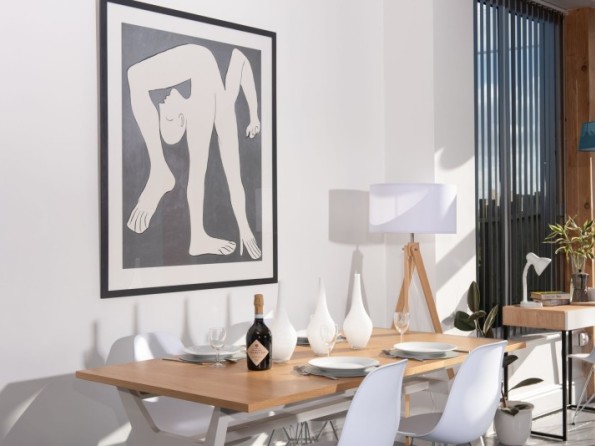 Open plan with living room and kitchen the dining area is light filled and welcoming. Furnished with a beechwood table with seating for 6, it has access out to the private terrace through floor to ceiling glass sliding doors.
