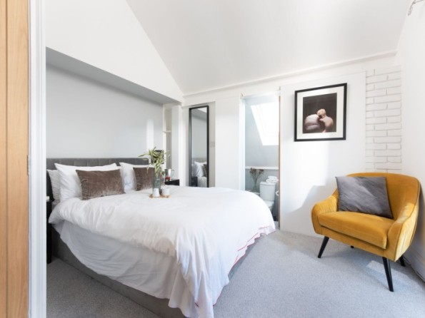 Open plan in design, the living/dining and cooking areas are bathed in natural light during the day thanks to floor to ceiling glass sliding doors. Opening out to a private terrace and lawn garden the views over the rural landscape are dreamy, so for outdoor meals or drinks al fresco it’s the perfect spot. After sundown when the mood switches, guests can camp out on the pudding sofa or squish chair for an evening of movies or, set up Monopoly on the dining room table and battle it out for Mayfair and Park Lane.