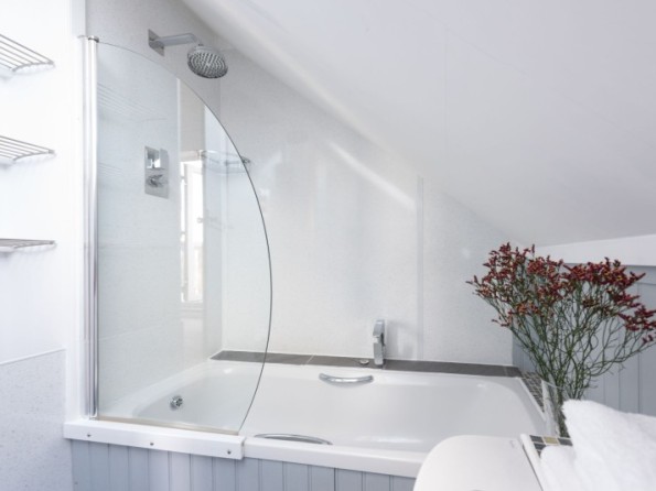 En-suite to the master bedroom this bathroom is bright and airy thanks to a large overhead roof light which opens. It features a bathtub with shower over, heated towel rail, hand basin with cabinet, a handy slatted wood bench seat and WC