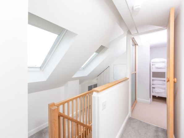 Also upstairs on the first floor, this room is furnished with bunk beds, a built-in wardrobe, hooks for hanging clothes and coats, toys, books and shelves. The room also has an en-suite bathroom as well as access via a loft ladder up to a mezzanine den (suitable only for children of 10 years and older)