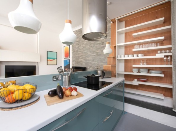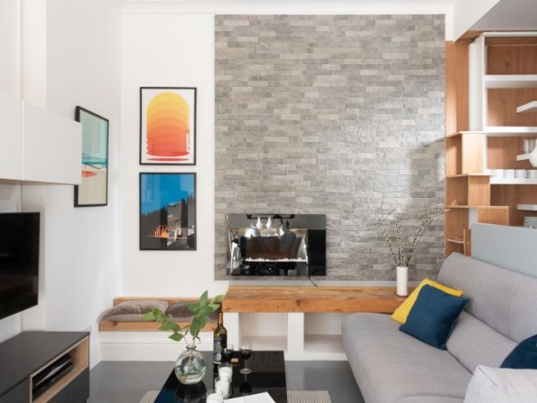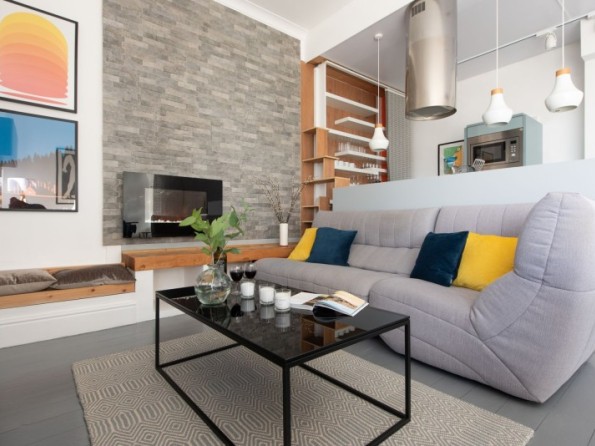 The ground floor living room is open plan with the kitchen and dining area. Its design elements include bold prints and a feature stone wall as well as modular cabinetry, built in bench seating and a smoked glass coffee table and electric fire. An oversized two-seater sofa and similarly squidgy armchair provide ample room to stretch out and relax. The room has a flat screen Smart TV with Sky, a BluRay DVD player and Bluetooth speaker as well as a sleek TV cabinet and bespoke bookshelves