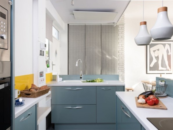 The contemporary kitchen is fitted with high gloss units and stone worktops, and features pendulum overhead lighting