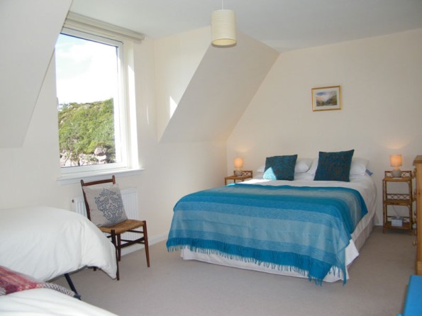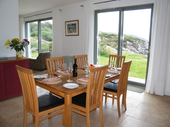 The house has three king size bedrooms (one has two additional single beds) all of which face south towards the Isle of Skye. The open-plan sitting room has a large window that takes in the spectacular view, a stove, a TV/DVD player, the kitchen/diner boasts an electric range cooker, and off the kitchen is a larder/utility room. Beyond the kitchen there is an extra sitting room/play room, and the house has two bathrooms. Bi-fold doors open up from the kitchen allowing a real connection with the sea.