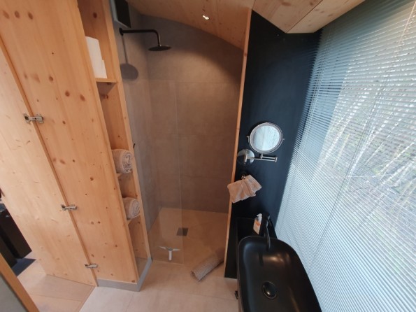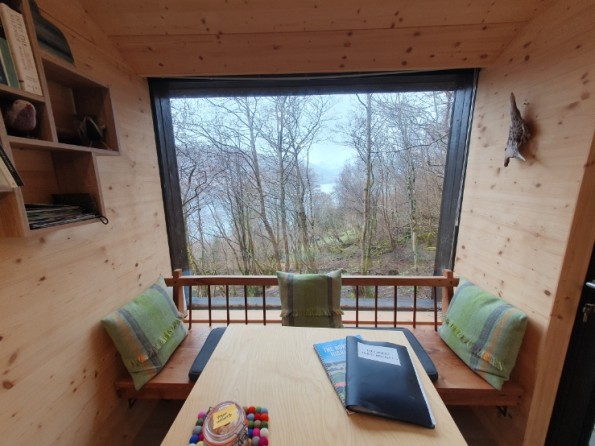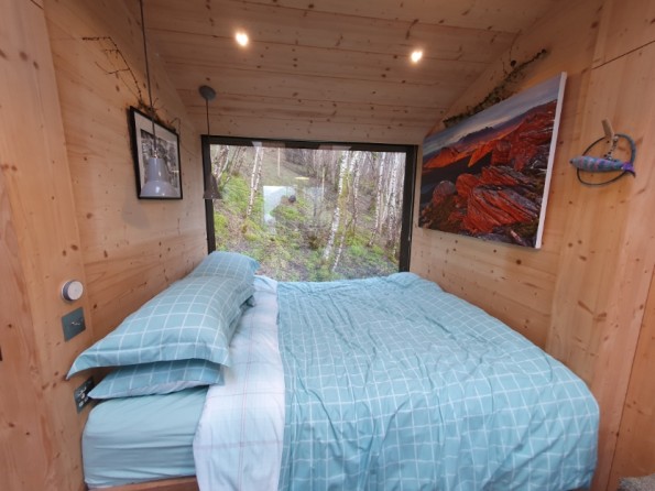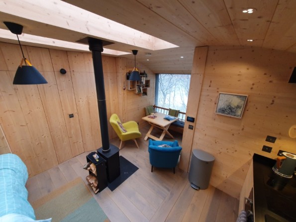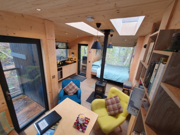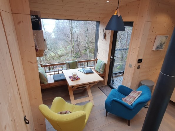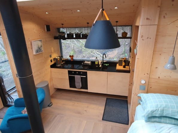 Tree Hoose has a larch exterior which blends beautifully with the surroundings. Its interior is bespoke and stylish - blond Italian cross-ply, a bespoke elm window seat, a wood burning stove and underfloor heating throughout. The interior is open plan. There’s a king sized bed, and the window seat folds out into a single bed if you need room for an extra. The fully fitted kitchen has an induction hob, electric oven and fridge with freezer compartment. There’s a dining table, plus a separate bathroom with a power shower. Wifi throughout.