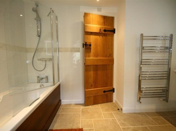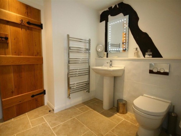 Bathroom with bath, power shower over, WC and basin, ground floor cloakroom with WC and basin.