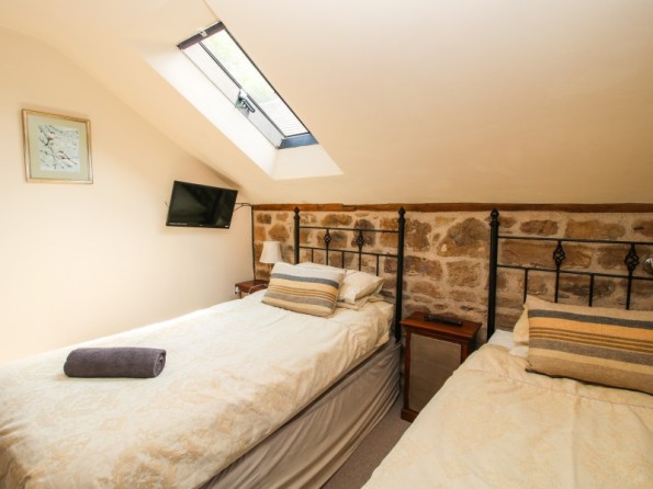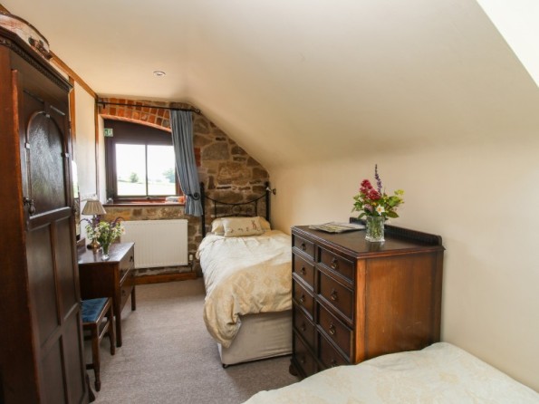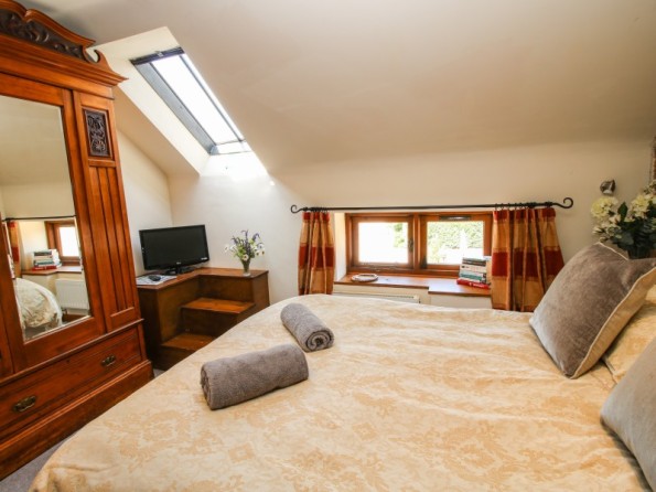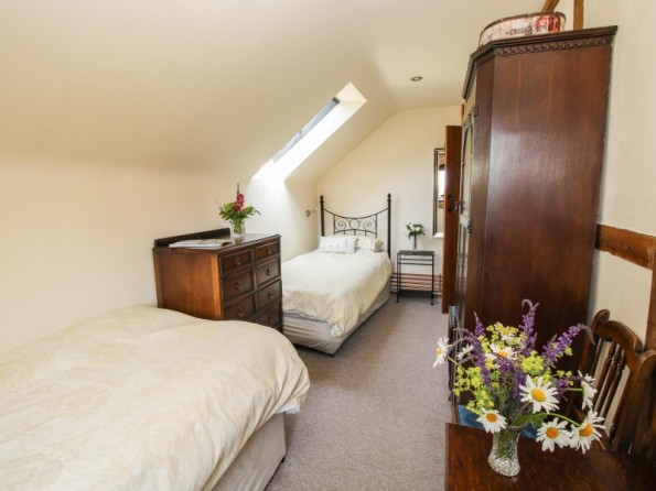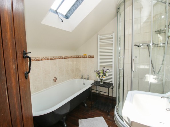 Over three floors. Four bedrooms: 1 x ground floor four poster king-size with en-suite shower, basin & WC, 1 x double, 2 x twin. Bathroom with roll-top bath, separate shower, basin & WC. Ground floor basin and WC. Lower ground floor fitted oak kitchen with breakfast bar and dining area with patio doors. Lower ground floor utility. Large ground floor sitting room with woodburner & patio doors with expansive views. Tiled entrance hall