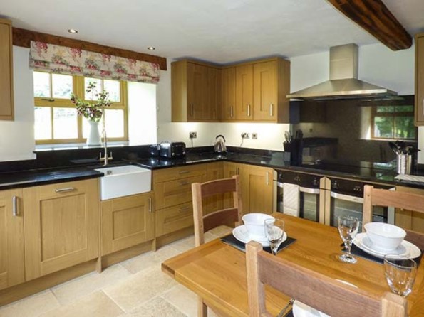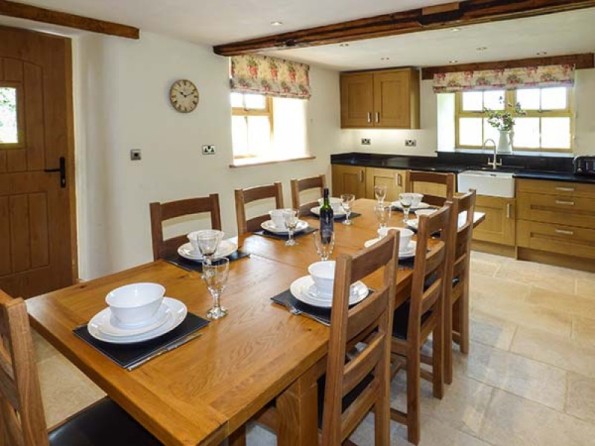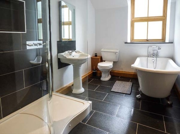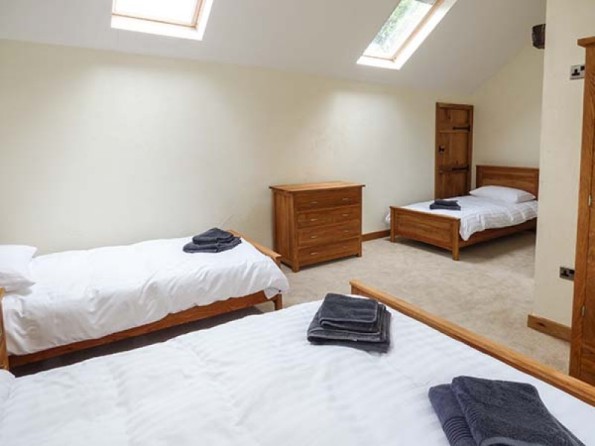 Four bedrooms: 1 x super king-size double with en-suite shower, basin and WC, 2 x king-size double (one with en-suite shower, basin and WC), 1 x family room with 2 singles and 1 king size bed with en-suite bath, shower over, basin and WC. Bathroom with bath, shower over, basin and WC. Ground floor basin and WC. Kitchen with dining area. Utility. Sitting room with woodburner.