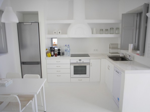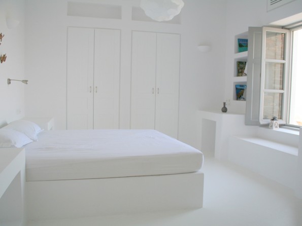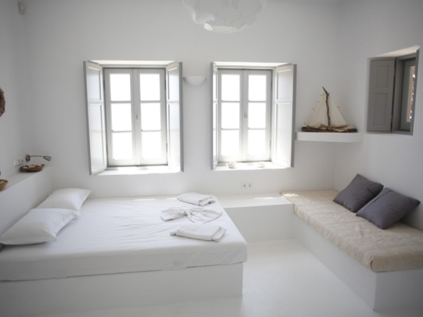 The villa encompasses 160sqm of space and is characterised both inside and out by pristine white stone. There is a sitting room with two sofa beds and a fireplace, a dining area, a fully equipped kitchen and a guest WC as well as two large bedrooms. The master bedroom features a king-size bed and an en-suite bathroom with a beautiful stone washbasin and a large built-in shower. The second bedroom is actually a studio with a private entrance and veranda. It contains a queen-size bed, two single beds, an en-suite built-in shower and a small fridge.