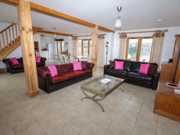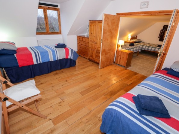 and additional single. First-floor, 1 x family bedroom with double bed and cot with en-suite, with walk-in shower, basin and WC, 1 x twin bedroom with en-suite, with basin and WC, leading to 1 x family bedroom with three single beds. Separate family bathroom with shower attachment, basin and WC. Open-plan living room with sitting area, dining area and kitchen area.