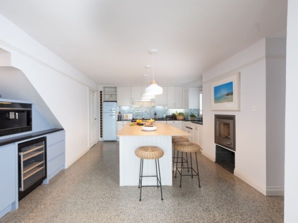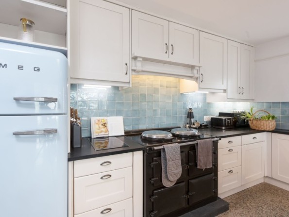 Fully fitted kitchen including Smeg fridge / freezer, microwave, kettle, toaster and selection of pots, pans and cooking utensils.