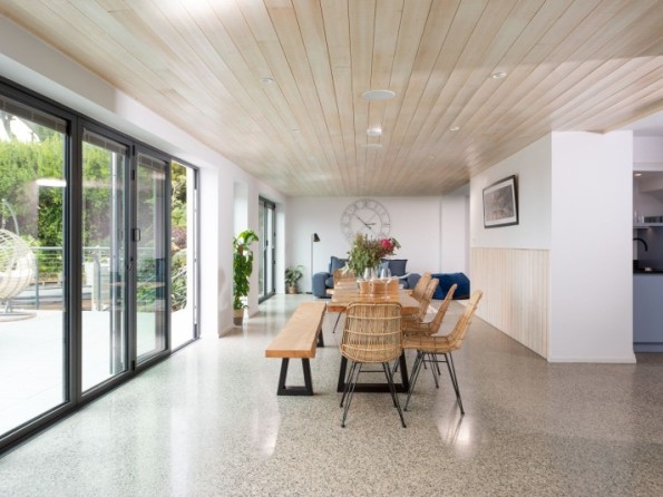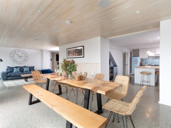 Large decked areas with picnic bench, outdoor lounge suite, table and spectacular views