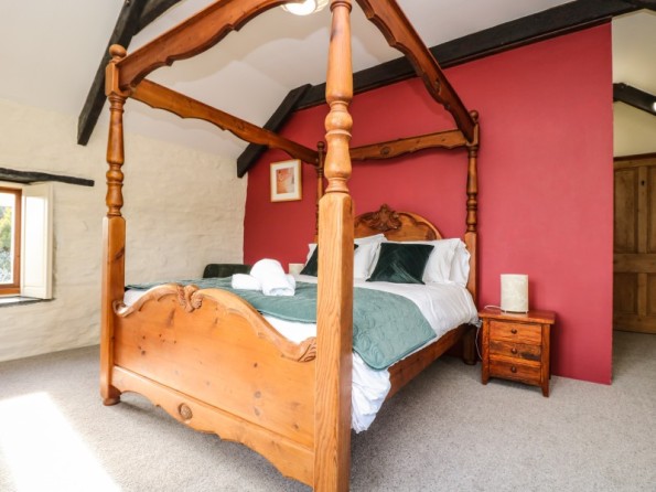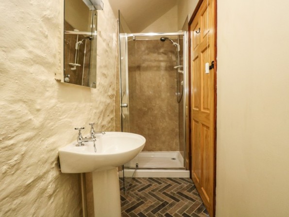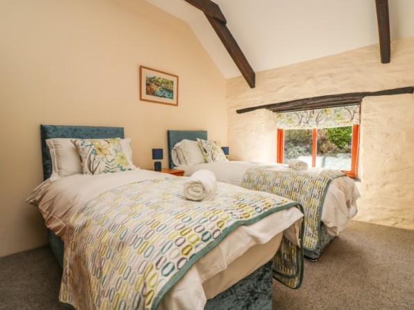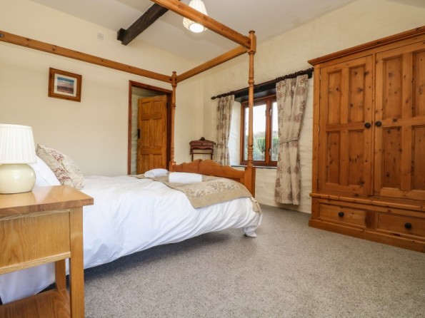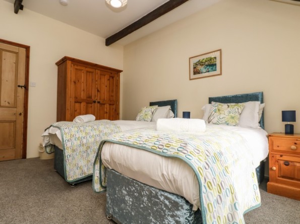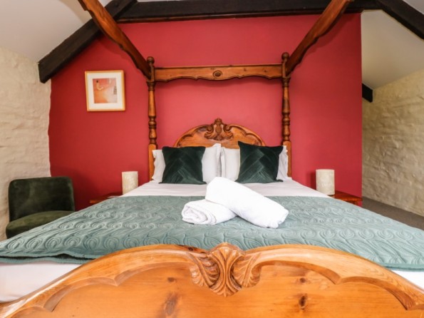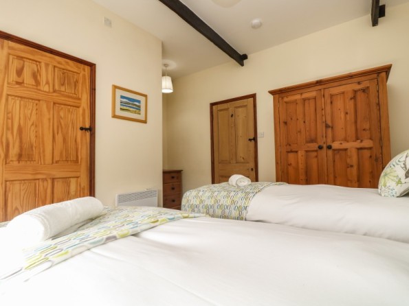 Over two floors. Three bedrooms: 1 x king size bed, en-suite shower room, basin and WC. 1 x twin beds or zip-linkable to a king size with ensuite shower room with shower, basin and WC. 1 x king size four poster with bathroom with bath, bidet, basin and WC. Cloakroom with WC. Kitchen / dining room, sitting room with wood burner stove. Shared use of the heated indoor pool.