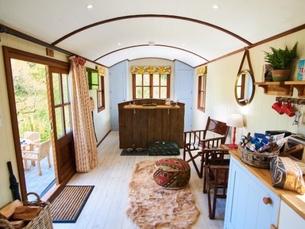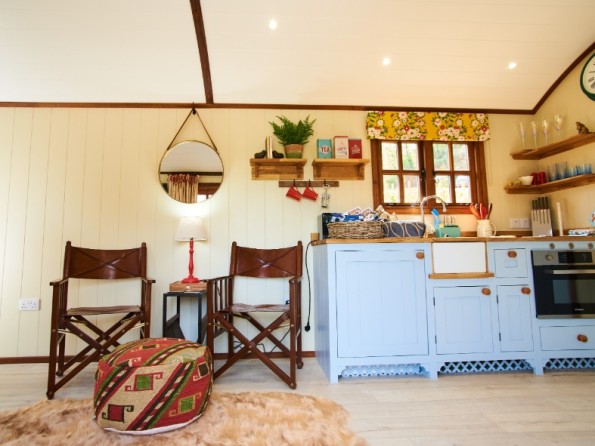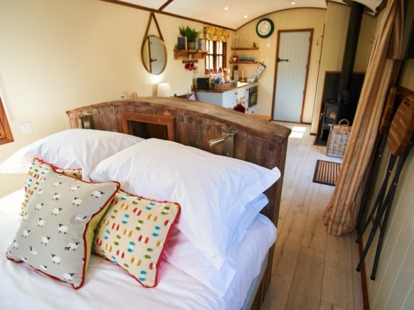 Handcrafted by local artisans, the shepherds lodge is 26ft long (offering 234 sq ft of space) so it has ample space for two adults. Inside the fabrics, furnishings and bespoke fittings make for a stylish and cosy retreat. There is a wood burning stove, a relaxation area, a fully equipped kitchen with foldaway breakfast bar, and king size double bed, and a bathroom with double walk in power shower. Two of the other shepherds lodges also have a double sofa bed and are able to accommodate a child (or two smaller children).