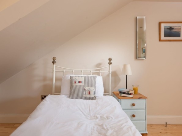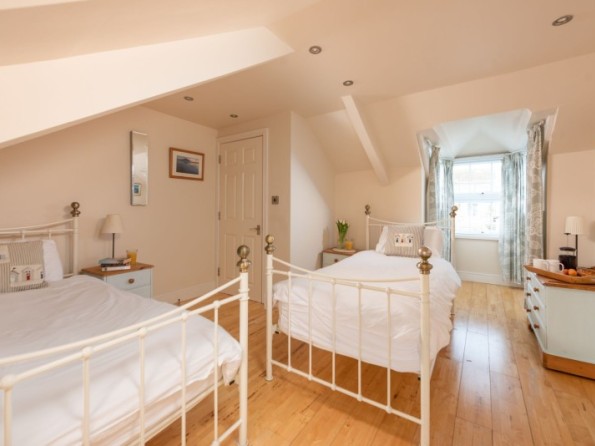 This second bedroom is also on the first floor and has lovely sea views. It is furnished with twin beds, bedside tables and lamps, a mirror, hanging space, a chest of drawers and mirror.