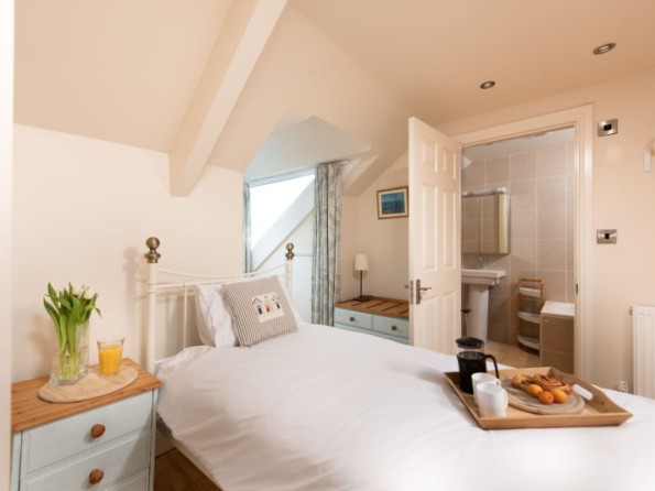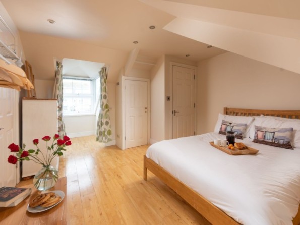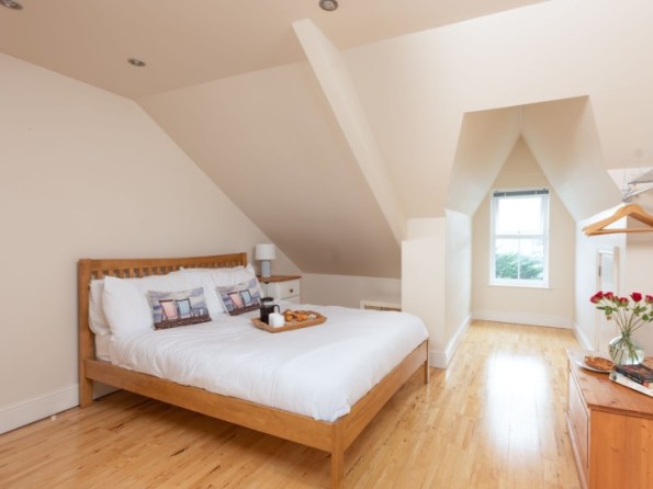 The spacious master bedroom is situated on the first floor off the stair landing and has wonderful sea views. It features its own en suite bathroom, a double bed, bedside tables with lamps, mirror, chest of drawers and hanging space