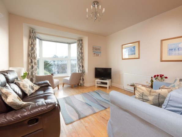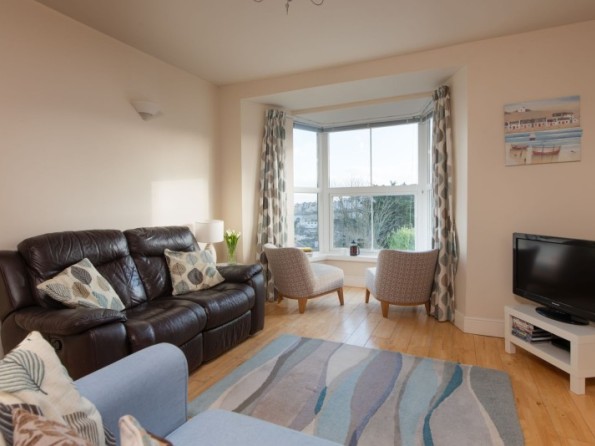 The room is furnished with two sofas and two armchairs positioned in the bay window. Other furniture includes side tables, a coffee table and TV cabinet and smart TV