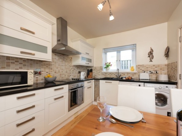 Amply equipped it offers plenty of storage and worktop space and features an electric oven and grill, an electric hob, a tumble dryer, washing machine, microwave, fridge, freezer and a dishwasher