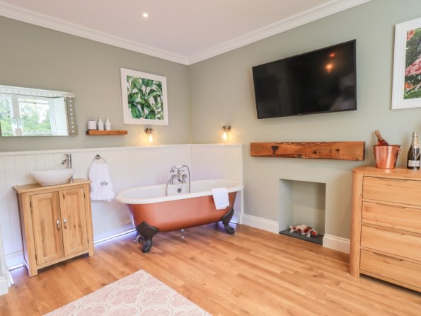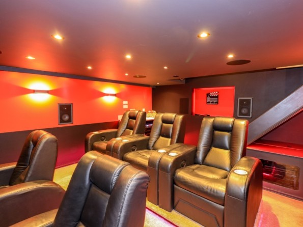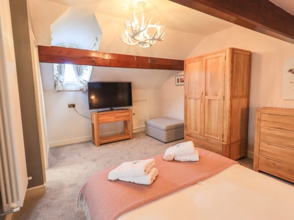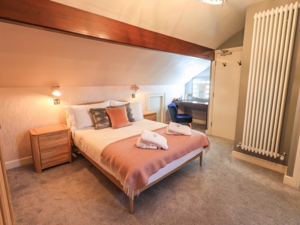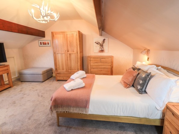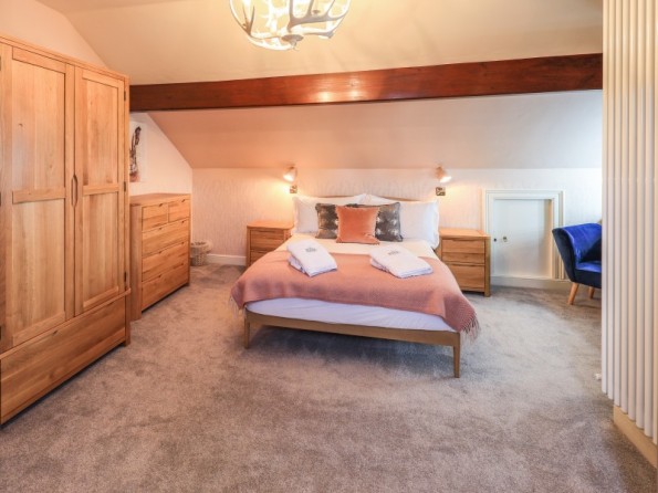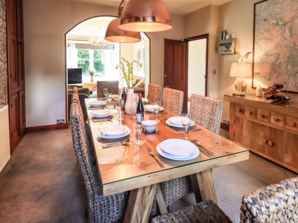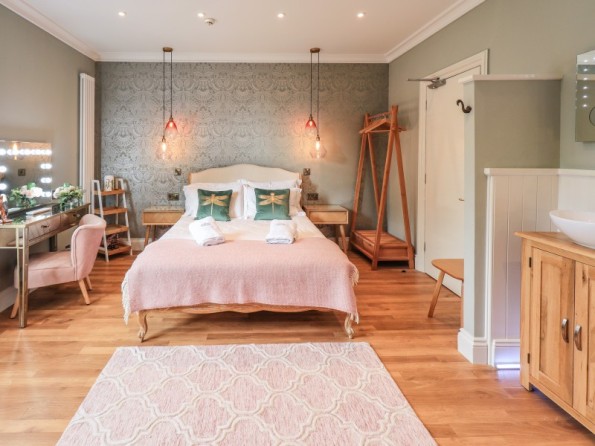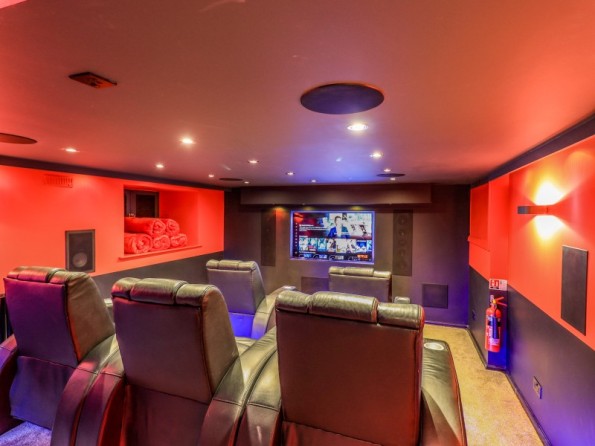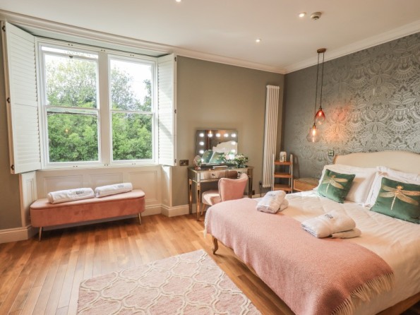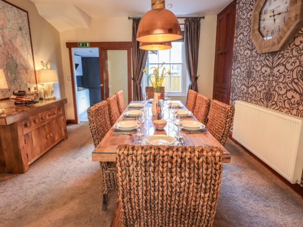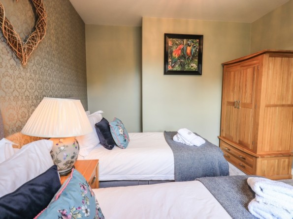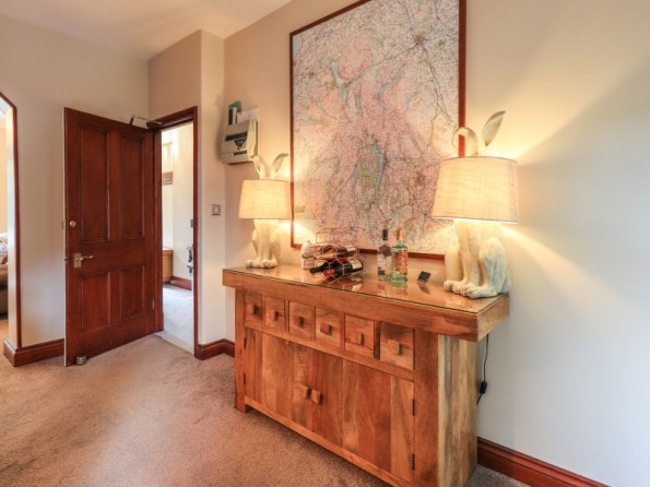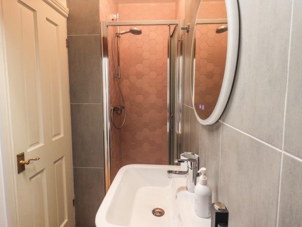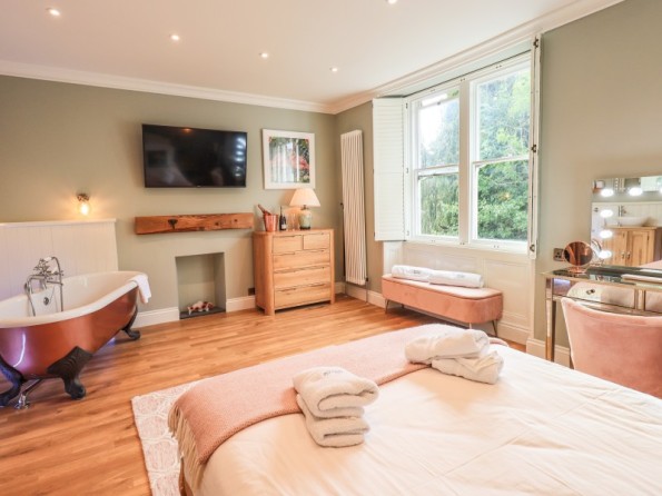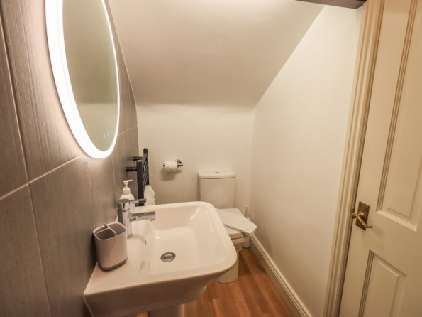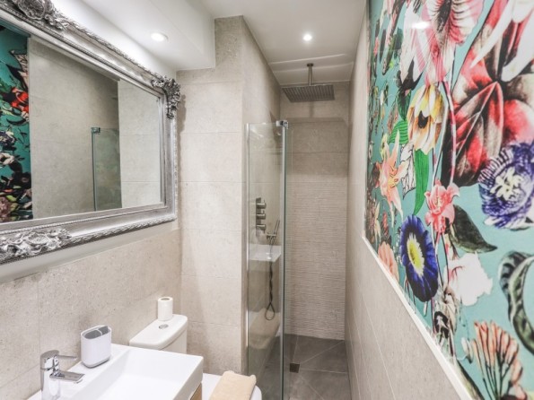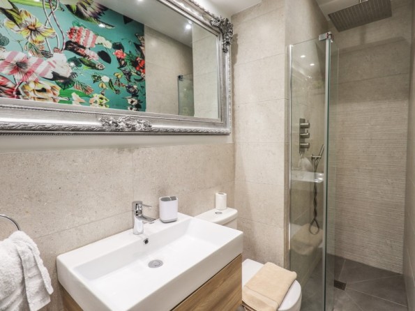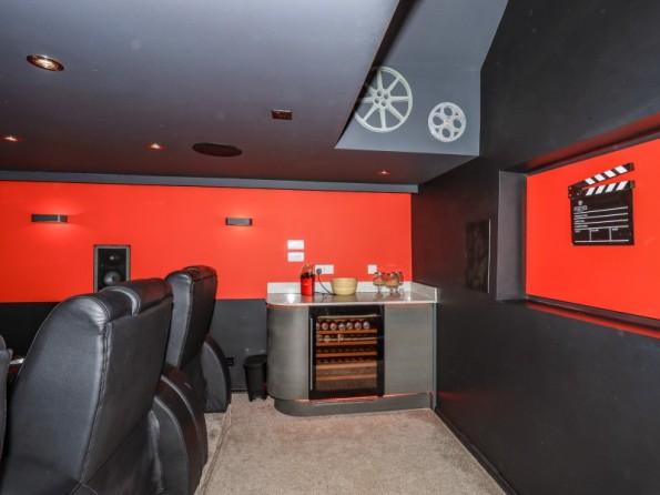 Over four floors. 1 x king-size with Smart TV, freestanding bath, hand-held shower, basin, 1 x double with Smart TV and en-suite shower, basin and WC, 1 x second-floor small double with Smart TV and en-suite shower, basin and WC, 1 x twin with Smart TV. Shower room with walk-in shower, basin and WC. Open-plan living space with kitchen, dining and sitting area with woodburning stove. Cinema room in basement