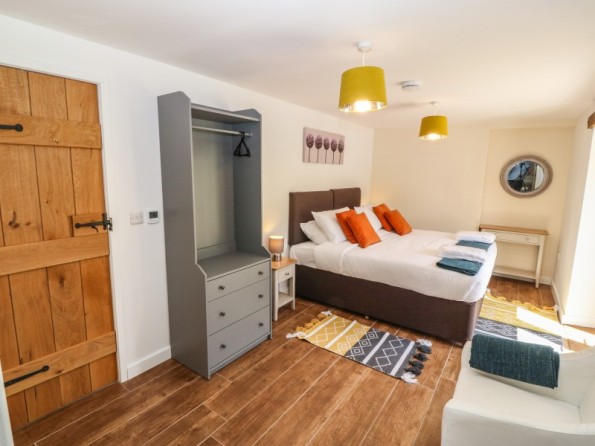 Over two floors. Four bedrooms: 1 x ground-floor super-king size (zip/link can be twins on request) with en-suite walk-in shower, basin and WC, 1 x ground floor king-size with en-suite walk-in shower, basin and WC, 1 x king-size (zip/link can be twins on request) with en-suite bath, walk-in shower, basin and WC, 1 x king-size (zip/link can be twins on request) with en-suite walk-in shower, basin and WC. Cloakroom with basin and WC. Open-plan living room with kitchen, dining area and sitting area with woodburning stove. Utility. Communal games room