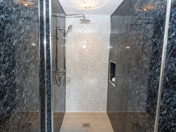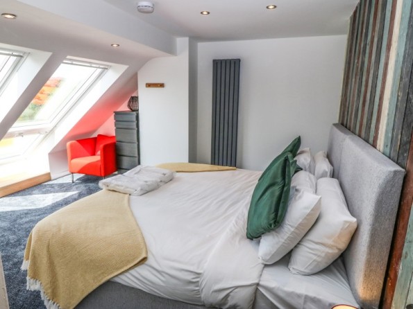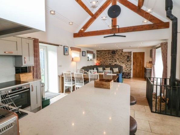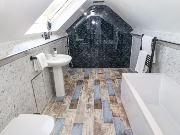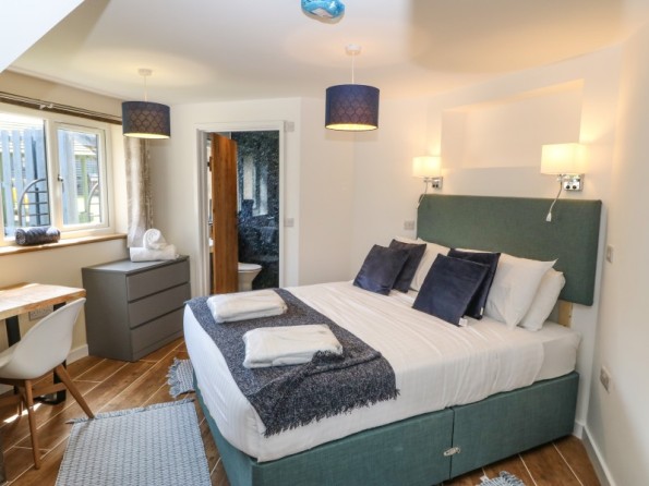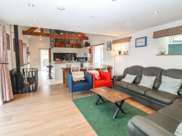 Over two floors. Three bedrooms: 1 x super-king-size (zip/link can be twin on request) with en-suite bath, wet room shower, basin and WC, 1 x king-size with en-suite walk-in shower, basin and WC, 1 x ground-floor king-size with en-suite wet room, walk-in shower, basin and WC. Cloakroom/utility with basin and WC. Open-plan living space with kitchen, dining area and sitting area with woodburning stove. Snug